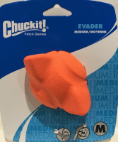 Chuckit! Evader is constructed from all rubber, and made to last for hours of game playing fun for your pooch. Ideal for fetch as well as games in small spaces and ground pursuit. Its random action will keep the dog guessing as to where its going to land. Made of a bright orange rubber and is hollow and light. Short Flight. Easy to clean. WARNING! For supervised play only. Know your dog and choose the appropriate size and type of toy to prevent choking or other harm. Inspect this toy regularly; if toy is damaged or if parts become separated, remove toy and parts as injury may result. Not a childs toy.