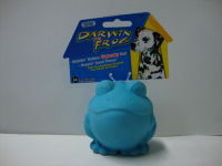 ENGLISH: Darwin the frog. Rubbitin rubber squeaky ball. Small. Hoppin good times. As with any pet toy, always supervise your pet while playing. Remove toy it damaged or if parts become separated, as injury could result.