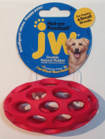 JW® Hol-ee® Football is a fun, versatile dog toy with the durability you have been searching for. Rubber gives it strength, bounce, and a soft texture while the unique open design allows you to stash some treats inside for hours of entertainment for your dog. This is a non toxic, durable, rubber, super-stretchy multi-purpose dog toy. Its a fantastic treat ball, wonderful training aid, great for fetch, toss and tug, chewing and teething.