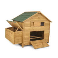 The Aspen Pet Chicken Fort is the perfect housing solution for the backyard farmer. The locking lid and multiple latches provide security from predators. This high capacity coop includes adjustable ventilation and wide rear access double doors. The triple roosting bars and three nests provide plenty of room for multiple hens to comfortably lay and the pull-out tray makes for easy clean up. Use with Chicken Fort Run (not included). Cod 443105