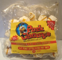 ESPAÑOL: Pork´s chomps. 18 unidades. Huesos con sabor a mantequilla de maní. 9 de cada 10 perros prefieren la carne de cerdo. Estos sabrosos huesos son la alternativa más segura de cuero crudo que ayuda ha que no se manche la alfombra. Disponible en mantequilla de maní , Pepperoni o tocino. Se recomienda para medianos o grandes perros.